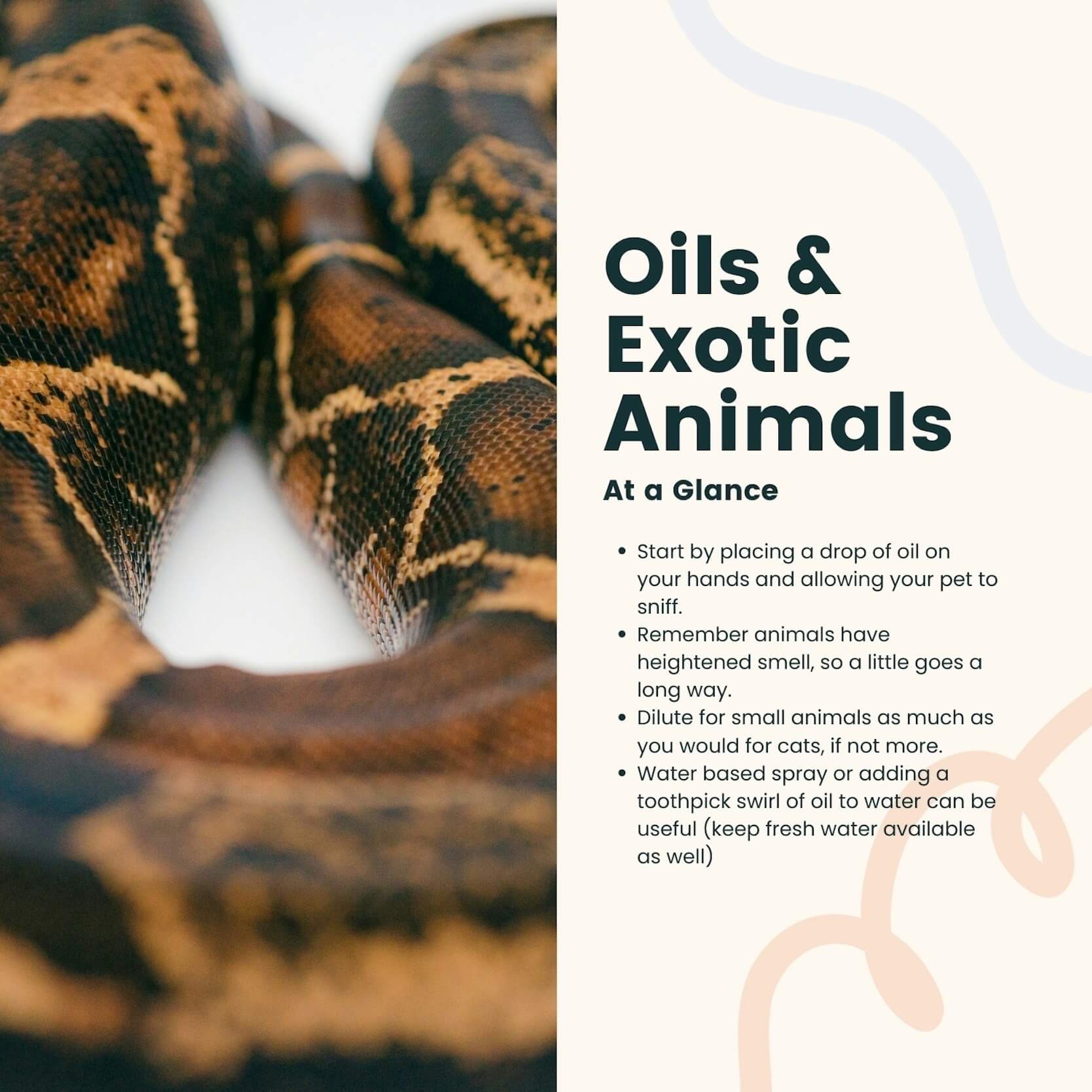 When it comes to reptiles, remember that like most other animals, they are much more sensitive to scents and tastes than humans. Even handling a reptile (or other fur-less exotic animal) with oil residue on your hands may be overwhelming to some. One simple way to test your animal's response to an oil is to place 1 drop somewhere in the animal's environment and note their reaction.