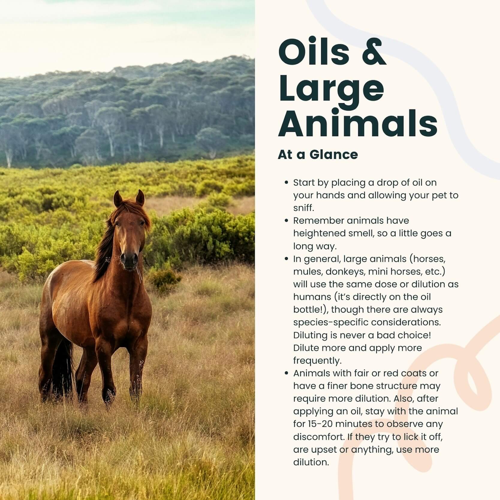 In general, large animals (horses, mules, donkeys, mini horses, etc.) will use the same dose or dilution as humans (it's directly on the oil bottle!), though there are always species-specific considerations. Diluting is never a bad choice! Dilute more and apply more frequently.