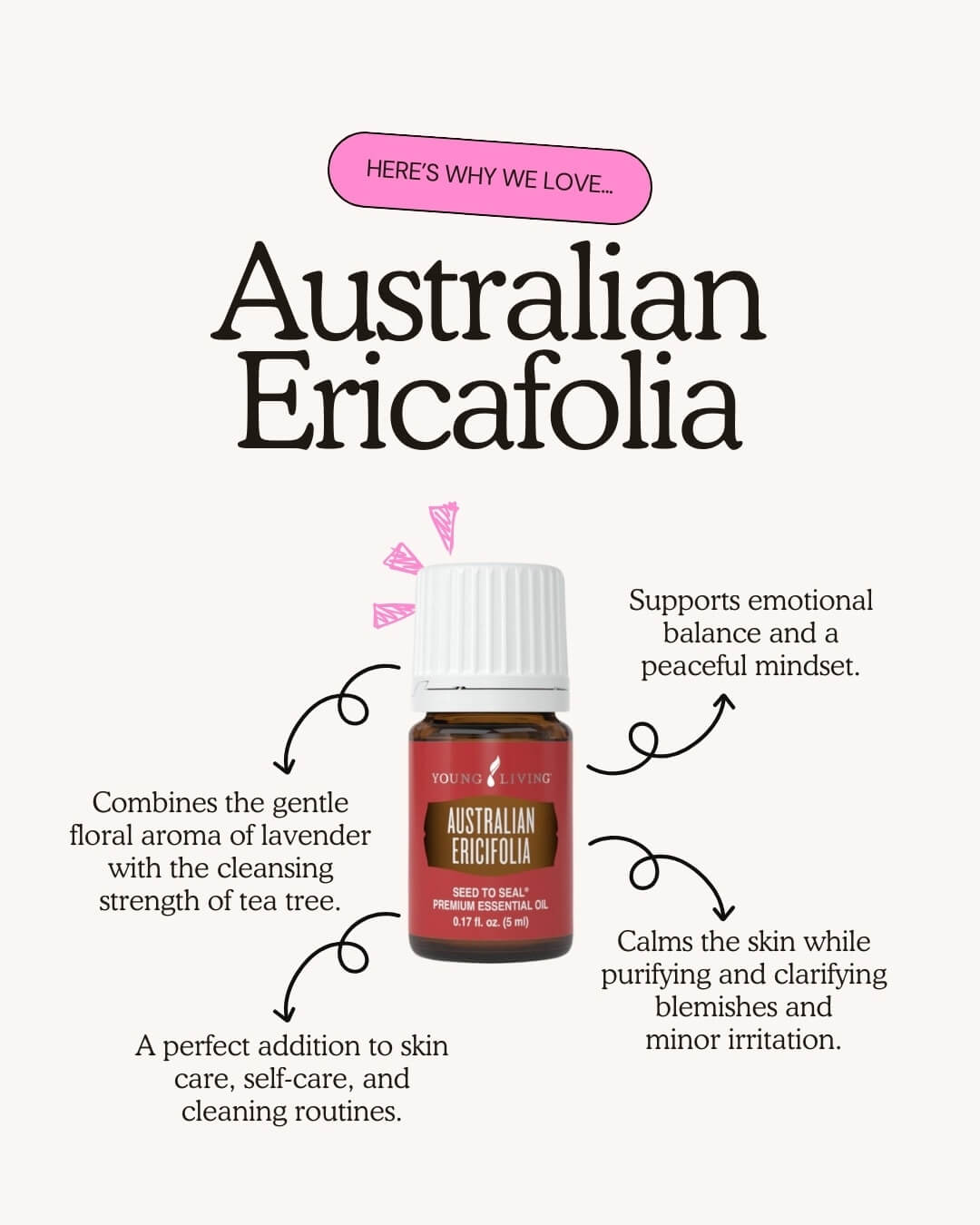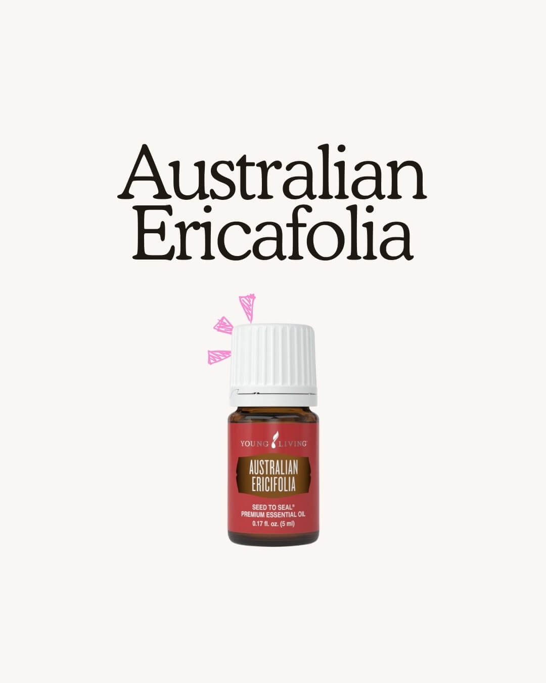 Add 2–3 drops of Australian Ericafolia to a diffuser with Lavender and Frankincense. Breathe deeply, visualize negativity clearing away, and set an intention for grounded strength.