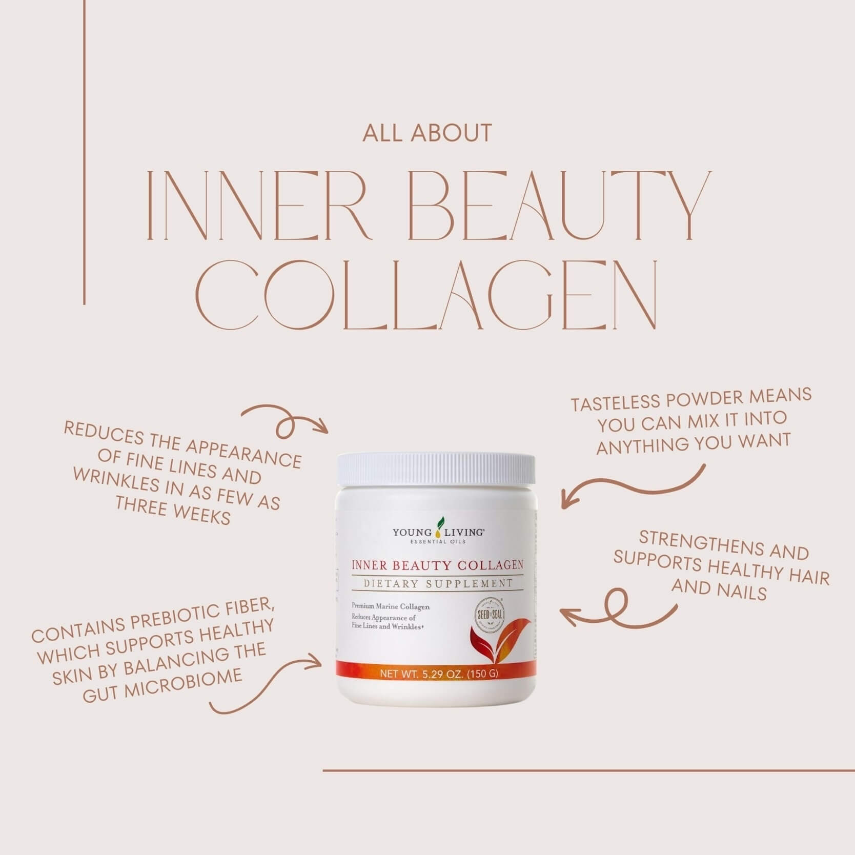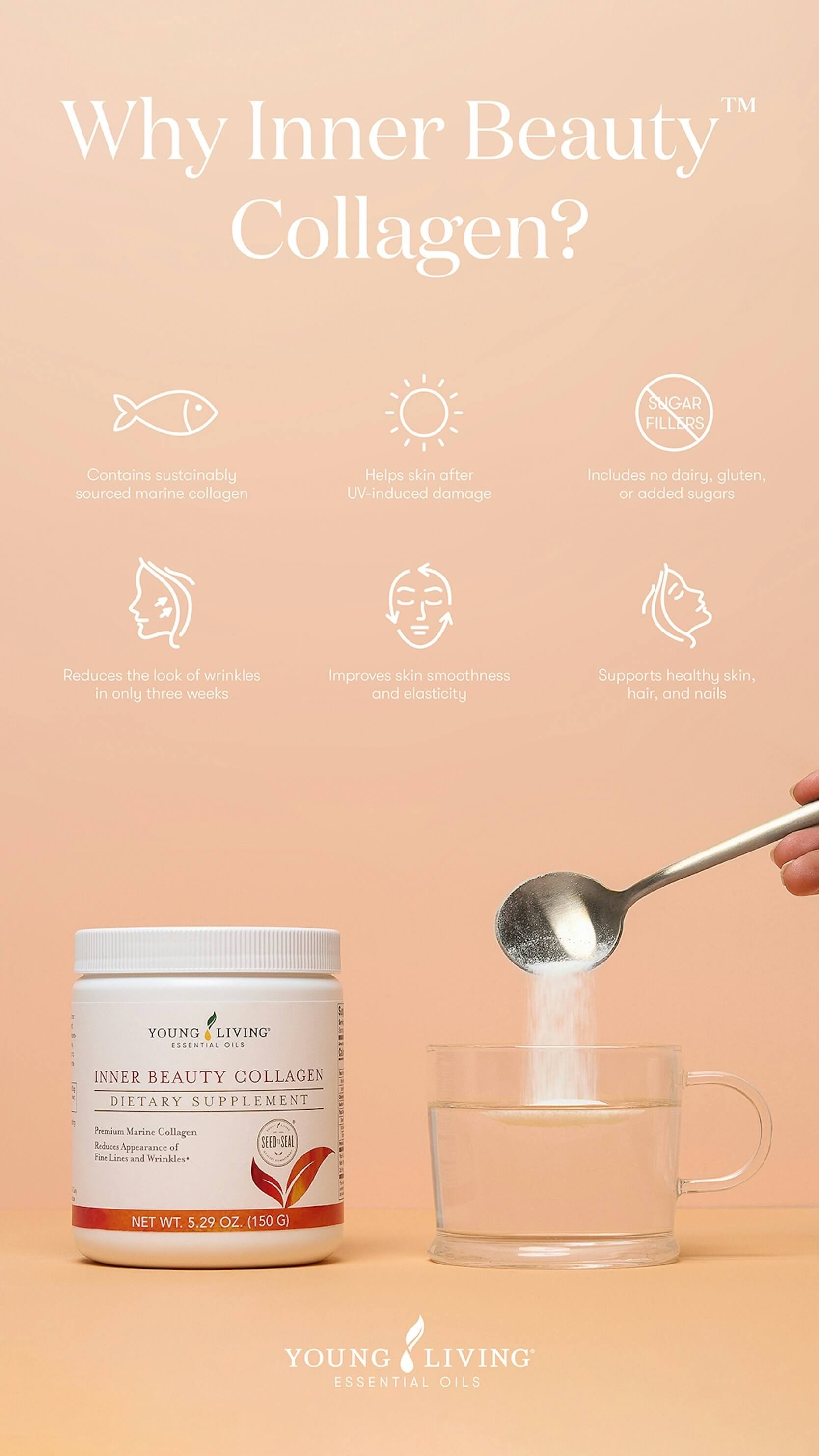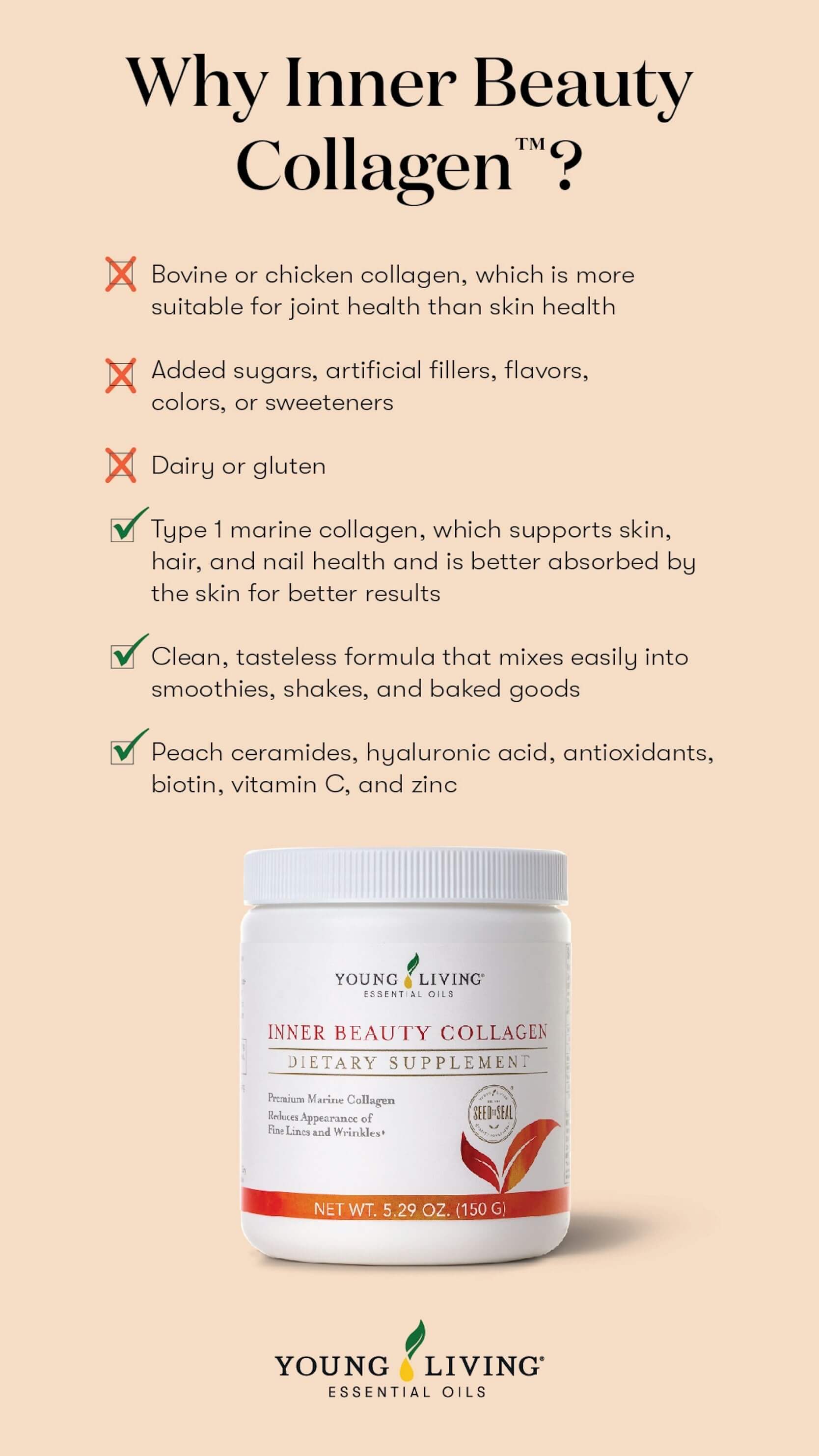 Inner Beauty Collagen is a marine collagen, sustainably sourced from fish, so it contains type I collagen, which is primarily known for its ability to improve hair, skin, nails, joint and gut health. Young Living's collagen supplement is the best, sustainably sourced marine collagen that is scientifically proven to provide results… and at the best price available.