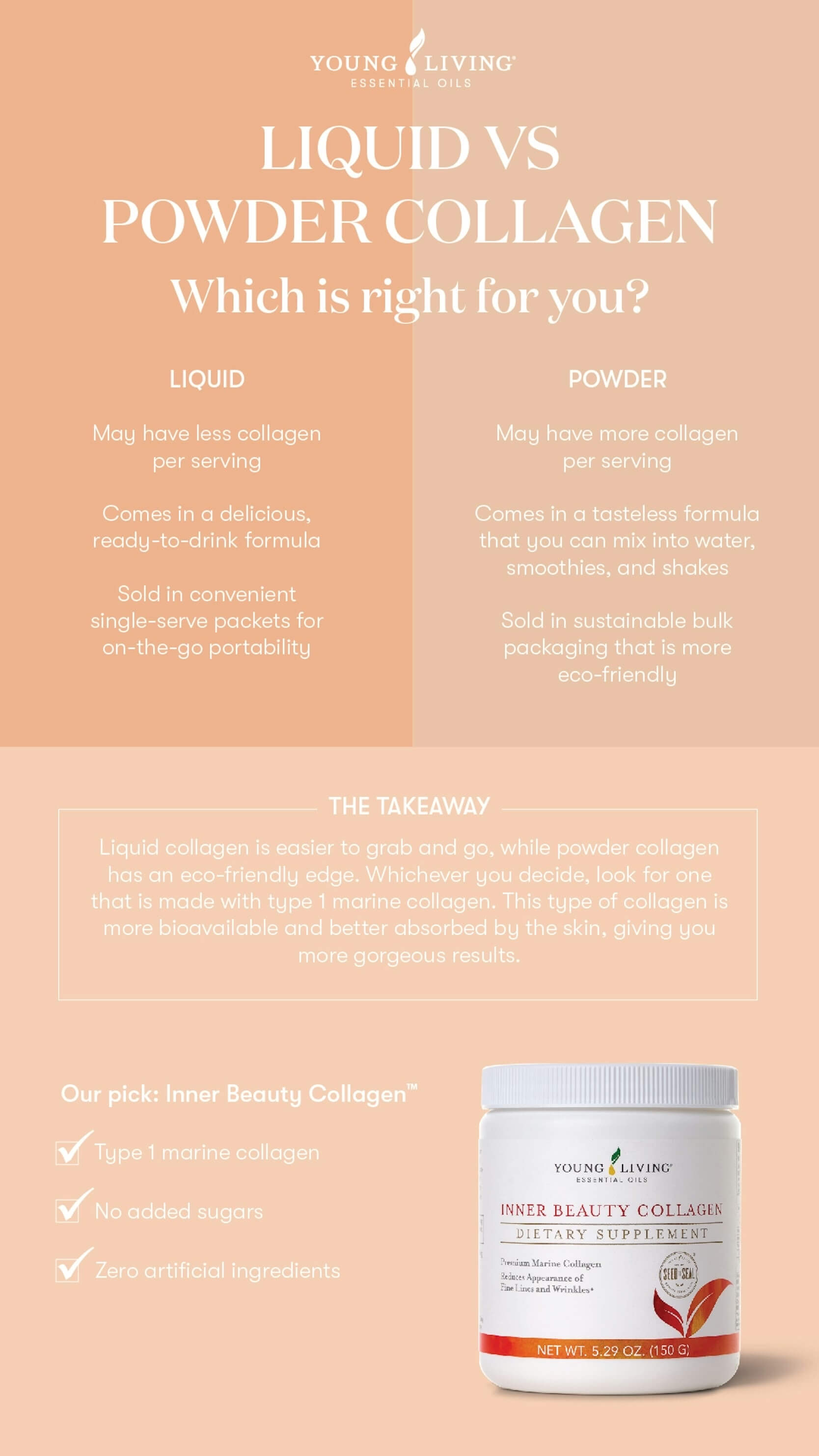 While both types of collagen have benefits, we prefer the Inner Beauty Collagen powder as it has more collagen per serving and is more bioavailable than typical liquid collagens, it comes as a tasteless powder that can be mixed into anything, and the bulk packaging is more sustainable and environmentally friendly than individual liquid packets.