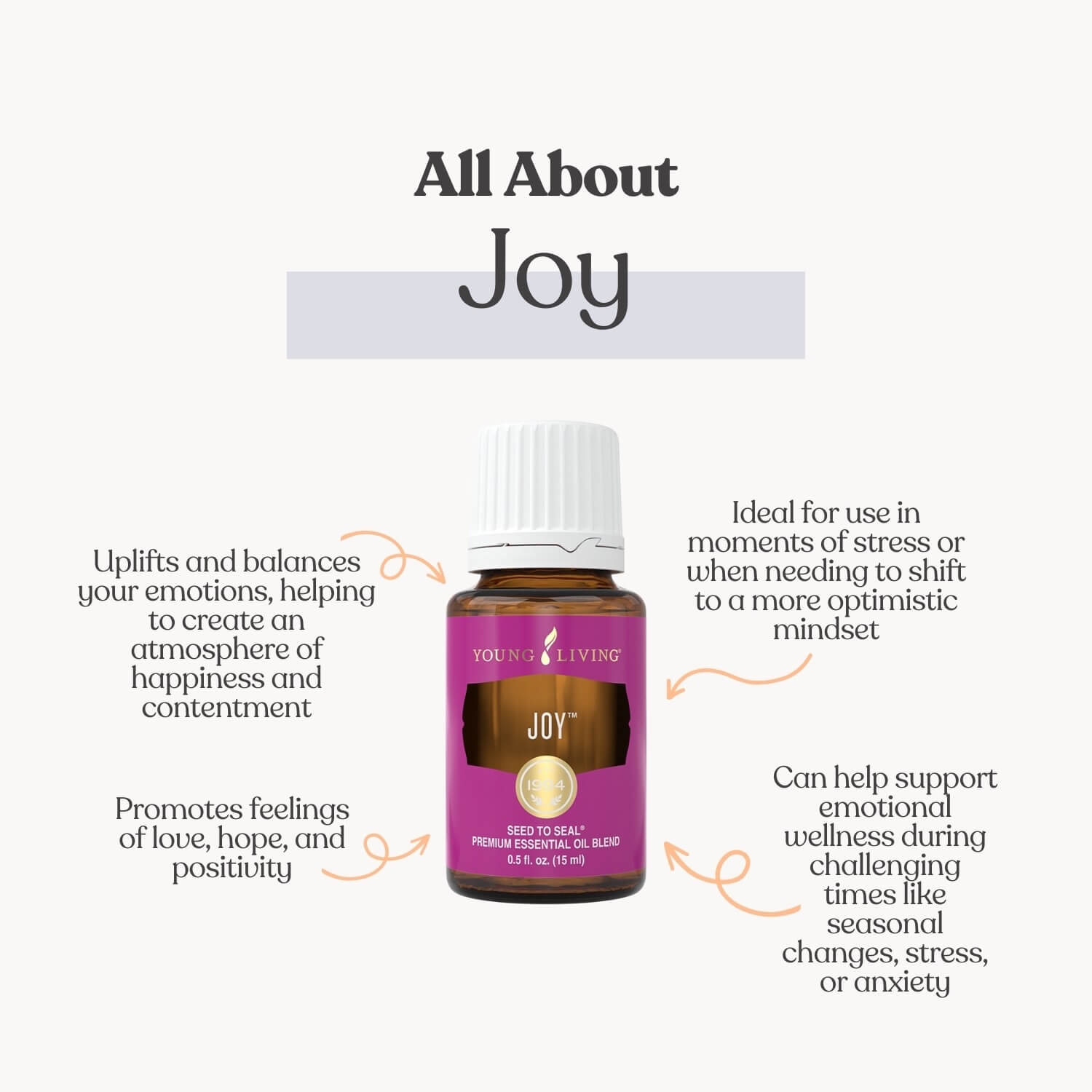 Make an easy roller to use daily. Combine 10 drops of Joy Essential Oil with 10 drops of carrier oil (like V-6 or jojoba) in a 10mL roller bottle. Roll on your wrists, neck, or behind your ears whenever you need a quick emotional pick-me-up.
