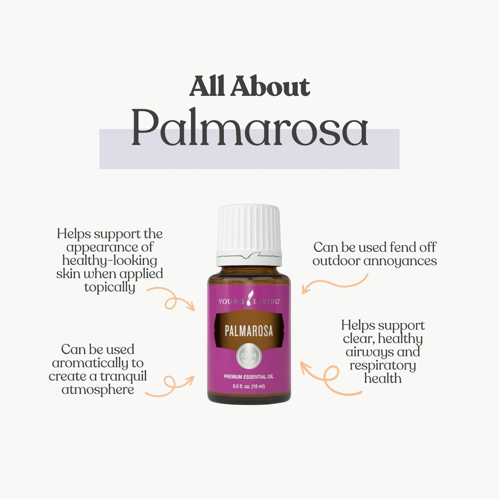 Palmarosa is like a fusion of citrus and floral with a hint of Lemongrass. It is fresh, crisp, and slightly sweet, and it is so incredibly versatile! Use this oil for beauty and skincare, to clear and support congested airways, to keep the outdoor annoyances at bay, to create a soothing, tranquil atmosphere, to support a positive outlook and soothe anxious emotions, or to give your space a little spring refresh anytime of year!
