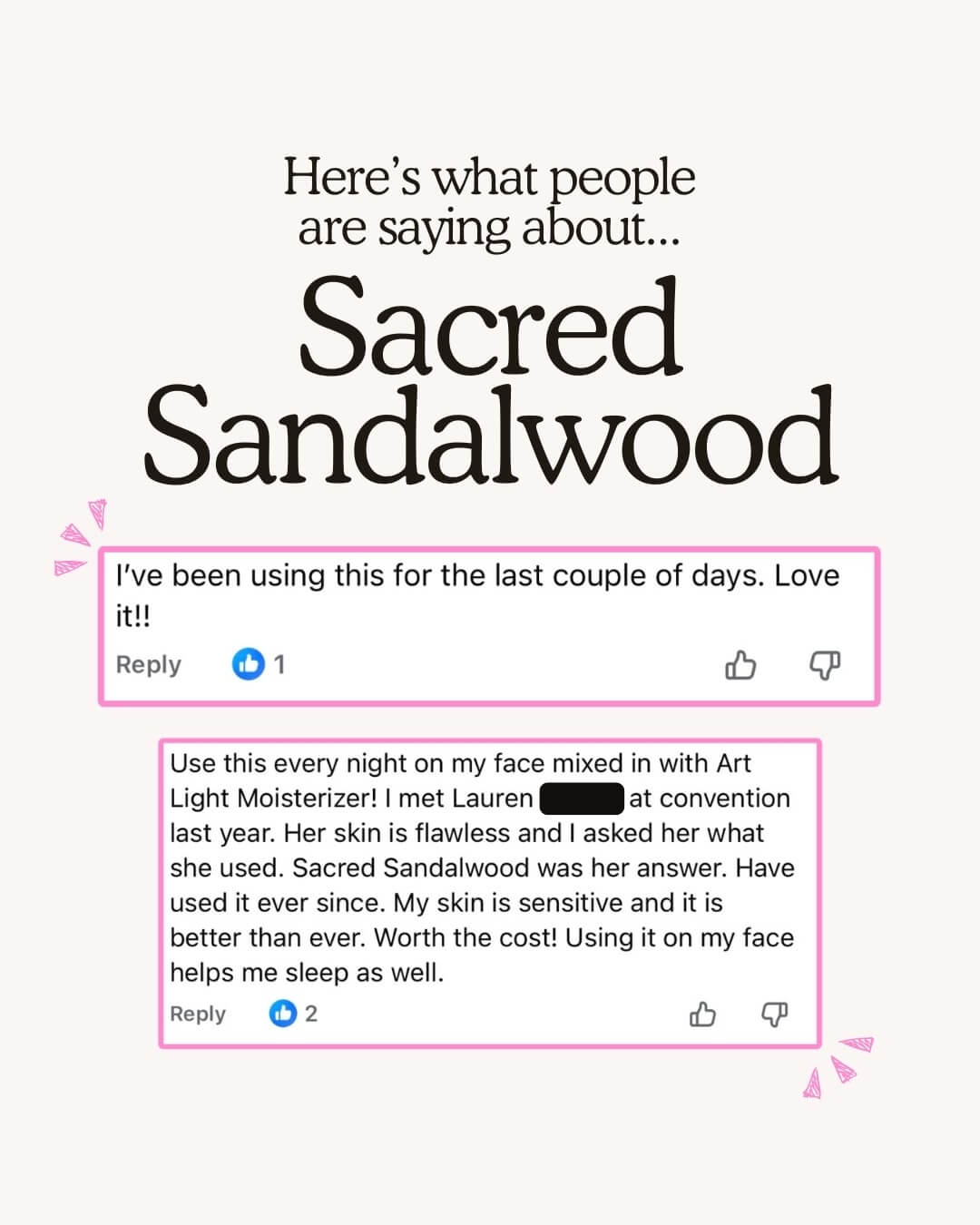 Use this every night on my face mixed in with Art Light Moisterizer! I met Lauren at convention last year. Her skin is flawless and I asked her what she used. Sacred Sandalwood was her answer. Have used it ever since!. My skin is sensitive and it is better than ever. Worth the cost! Using it on my face helps me sleep as well."
