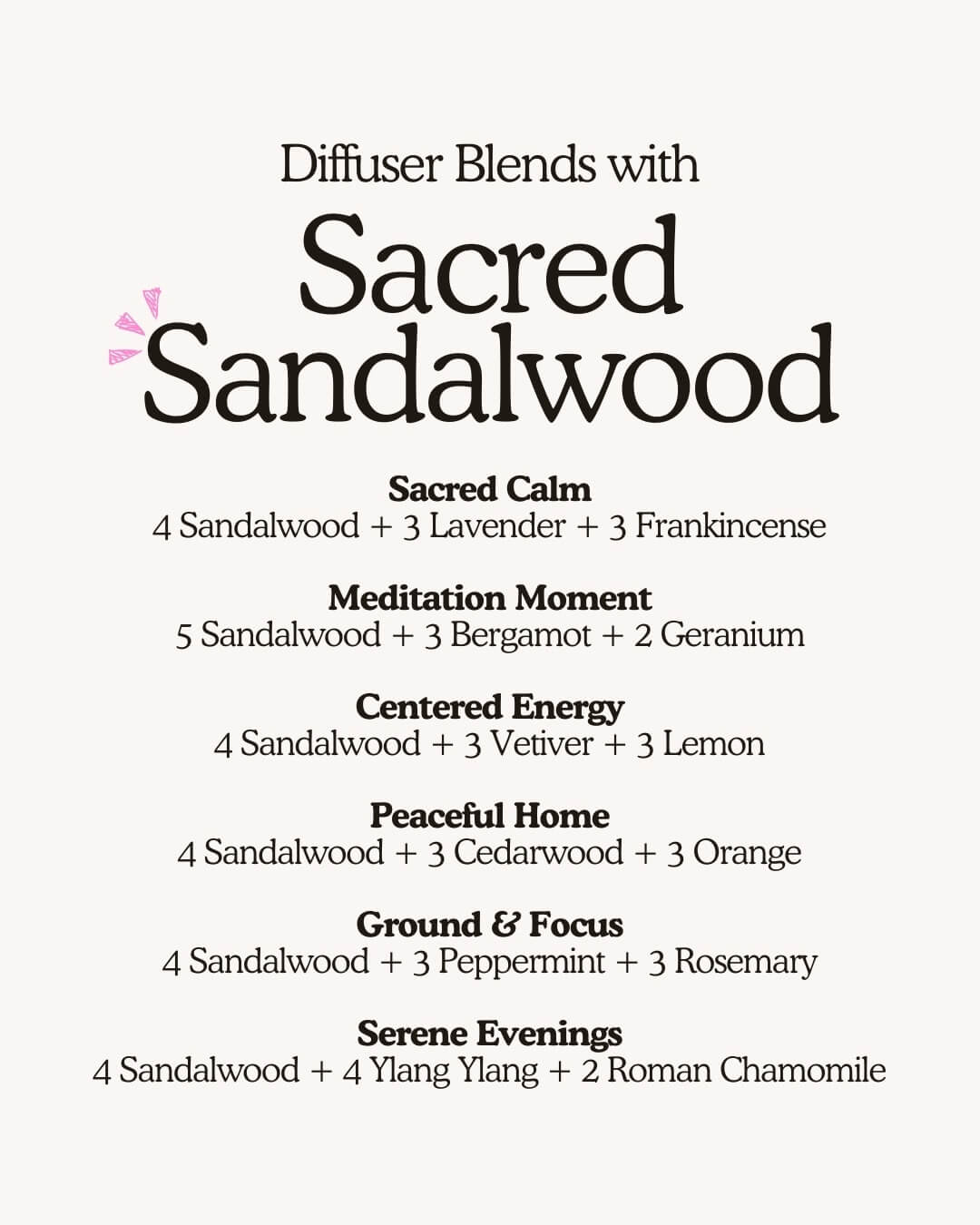 Sacred Calm: 4 drops Sandalwood, 3 drops Lavender, 3 drops Frankincense